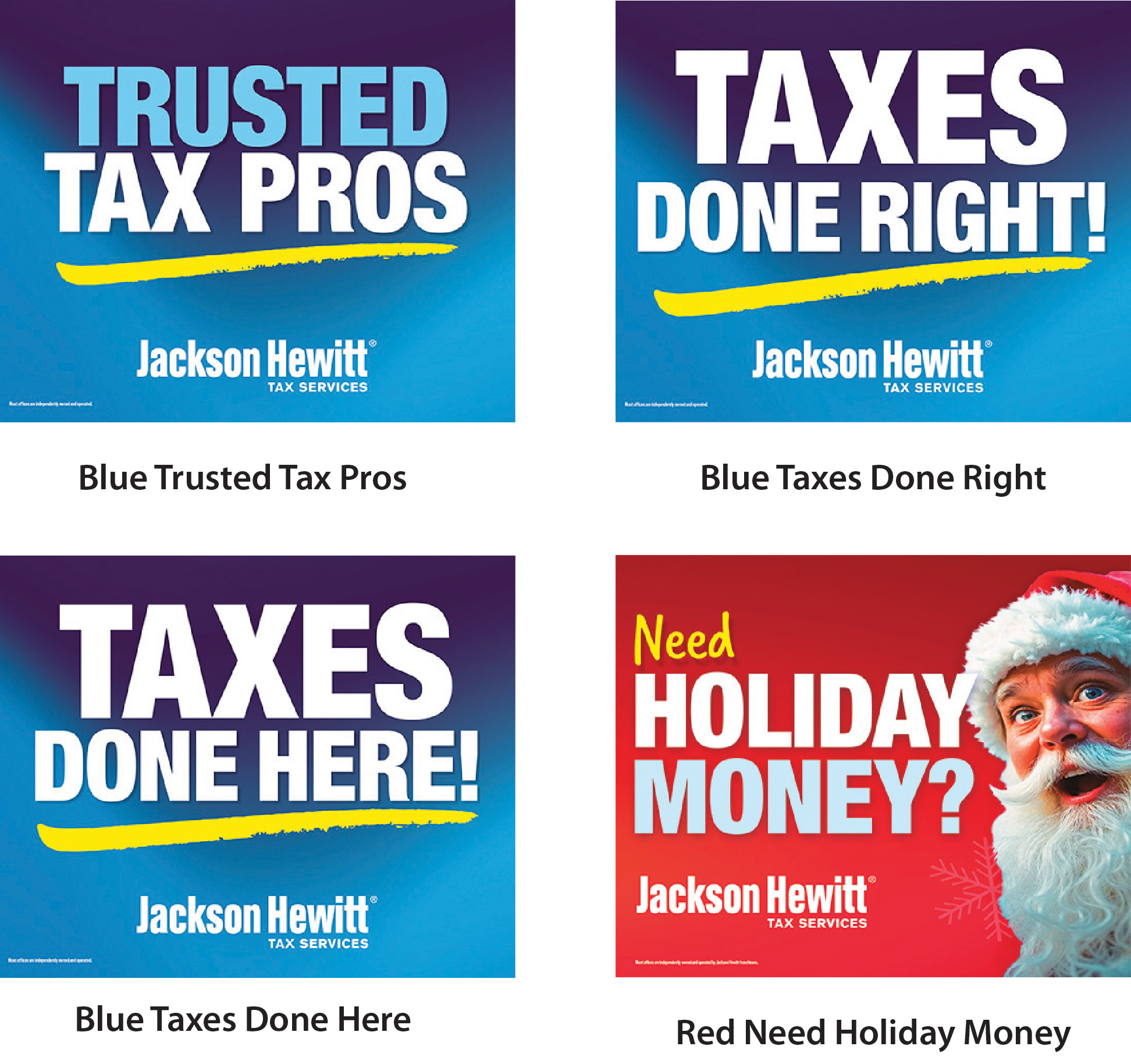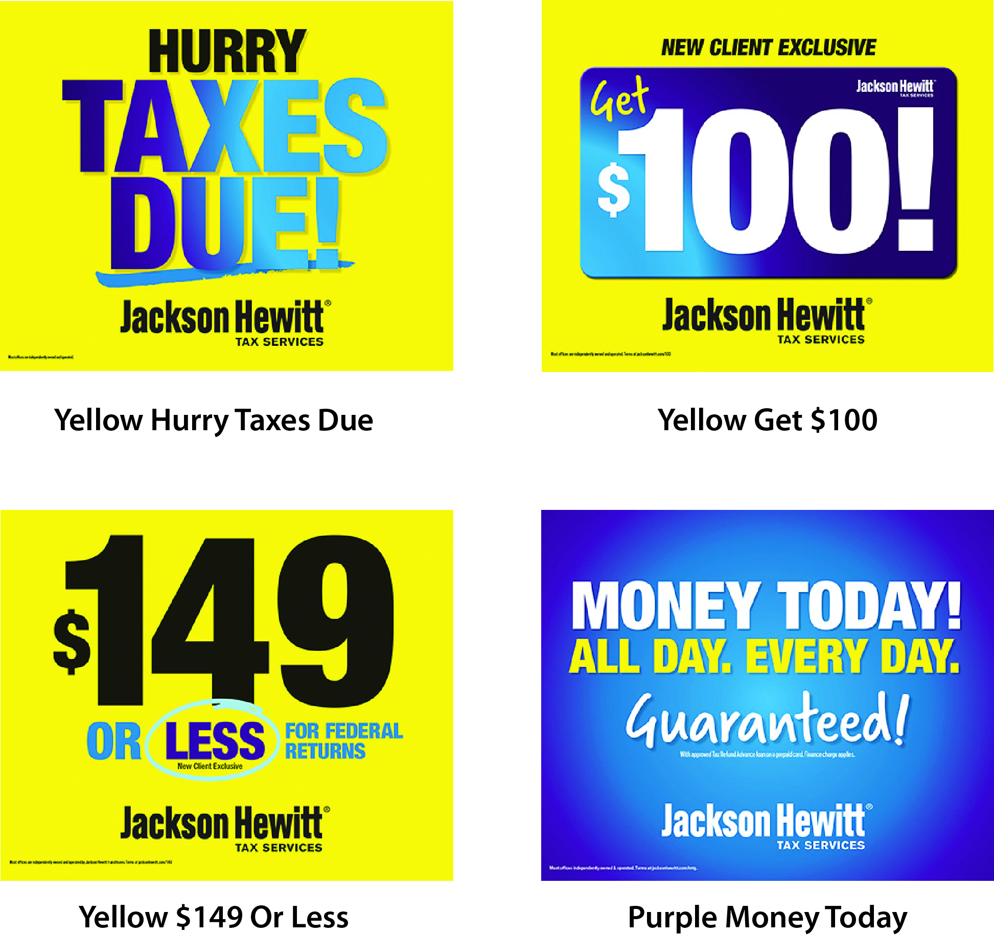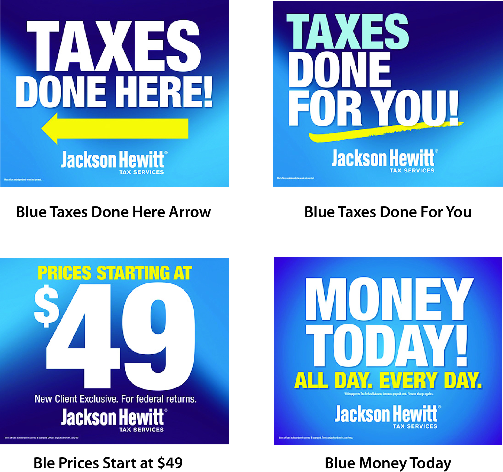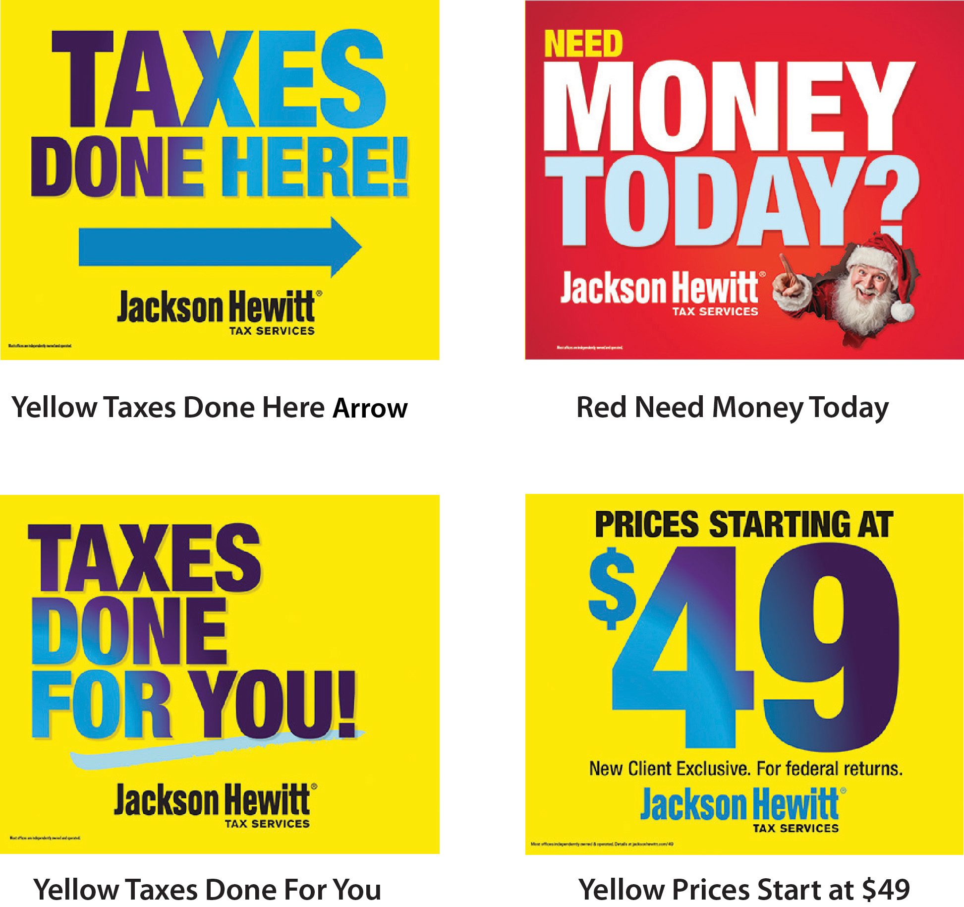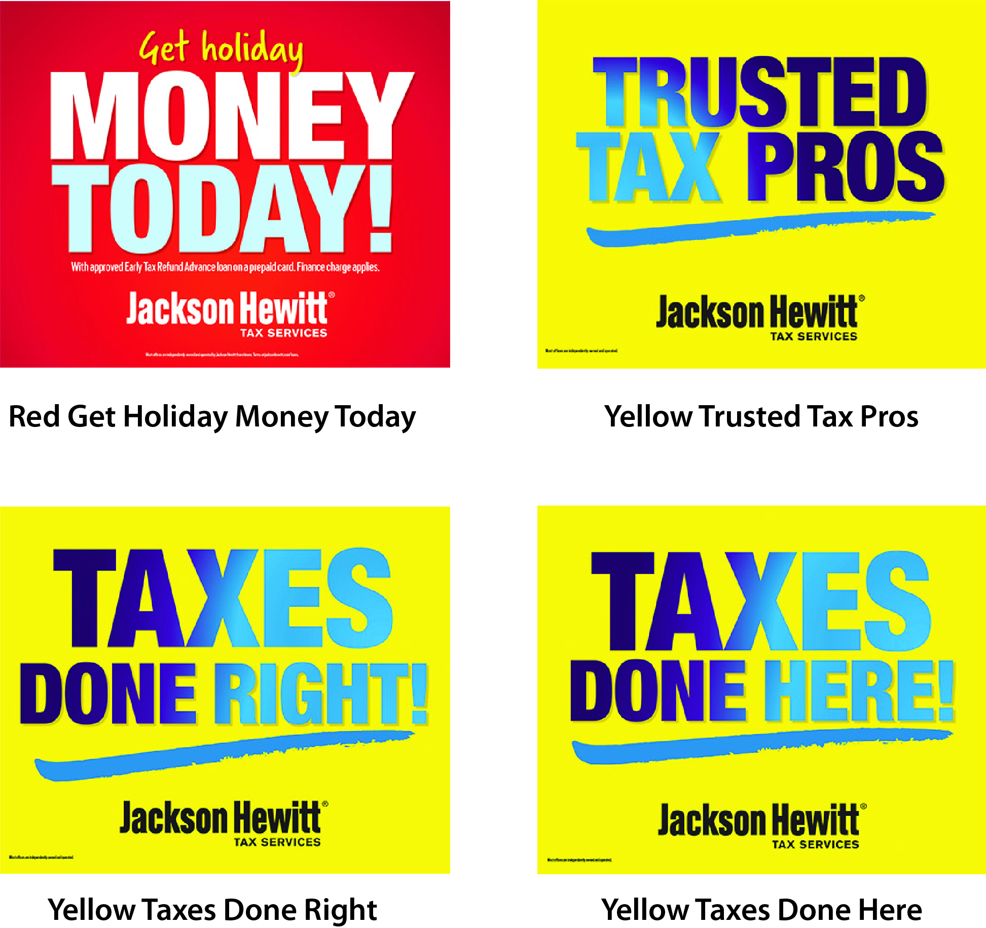 Artwork:  We print all the Jackson Hewitt yard sign messages that are on Brand Central.
